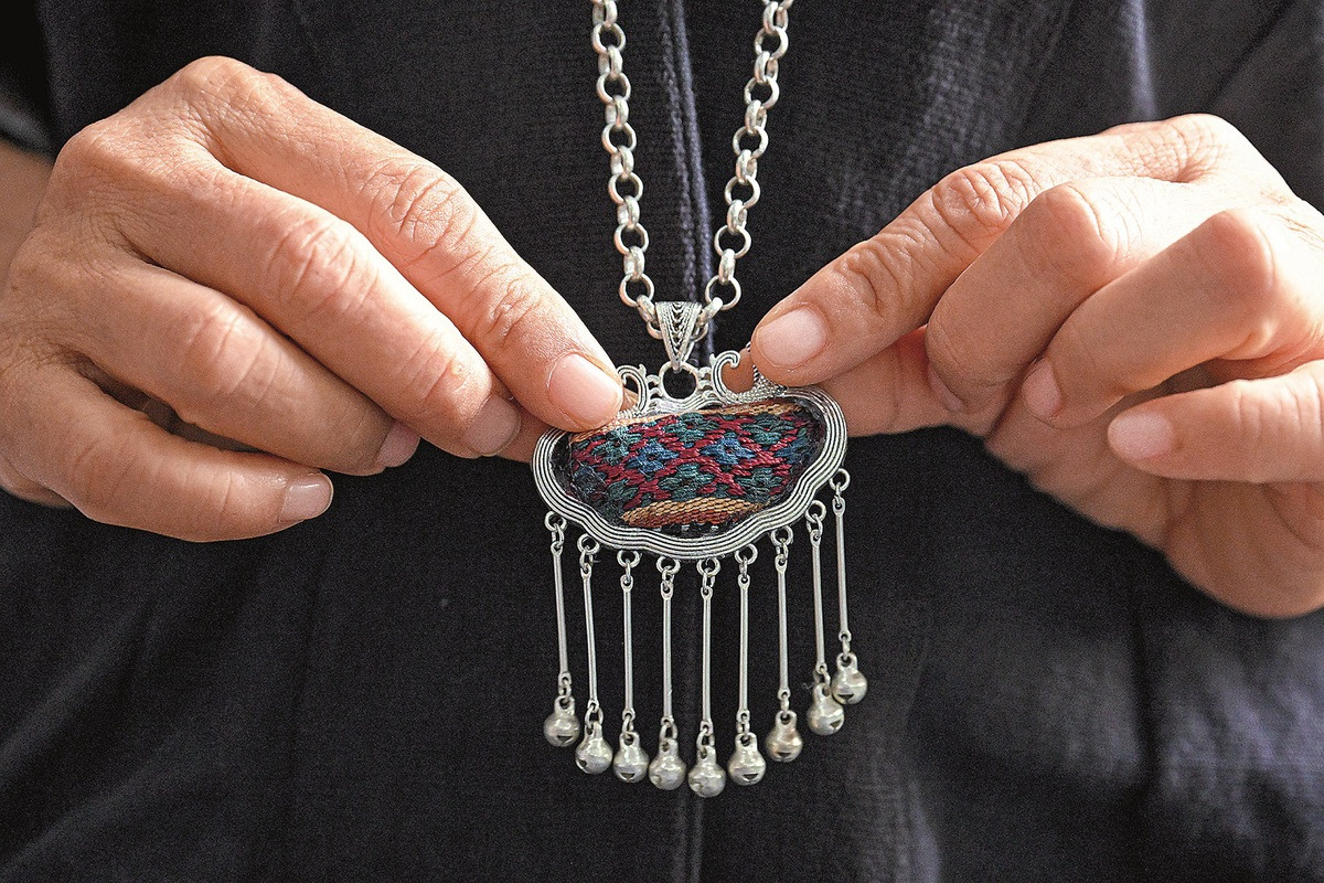 A Li ethnic woman displays a pendant made with traditional Li textile techniques in Dongfang, Hainan province. PU XIAOXU/XINHUA