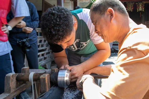 An international student is guided in crafting tinware. [Photo/Tide News]