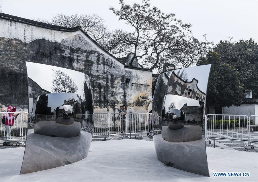 Artworks are displayed during an exhibition in Wuzhen of Tongxiang City, east China's Zhejiang Province, March 30, 2019. The 2019 Wuzhen Contemporary Art Exhibition opened here on Saturday, during which 90 artworks from 23 countries and regions will be displayed. (Xinhua/Xu Yu)