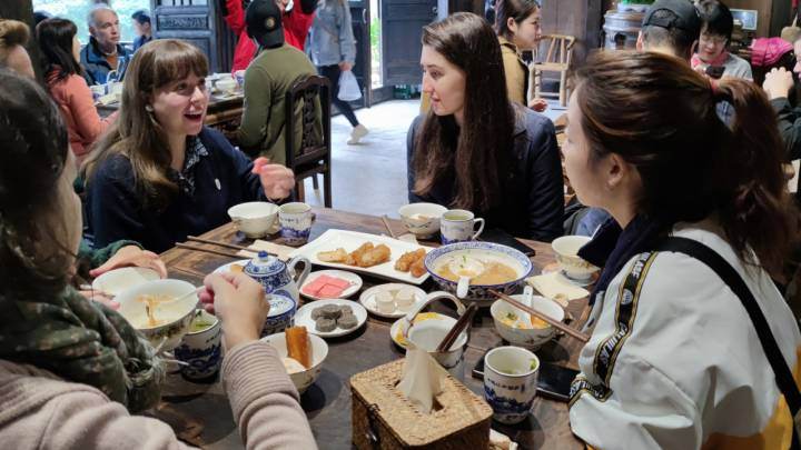 When it comes to Lanxi food, you must have tasted the morning tea of Youbu Ancient Town. At a time when the experience group arrived in the morning at the Youbu Ancient Town, the street offering various morning tea was already alive with people. A bowl of tea, four plates of dim sum, and deep-fried dough sticks, sesame seed cake, and egg pancakes served in proper sequence. This experience offered them a deep cultural experience of the unique morning tea culture in Lanxi.