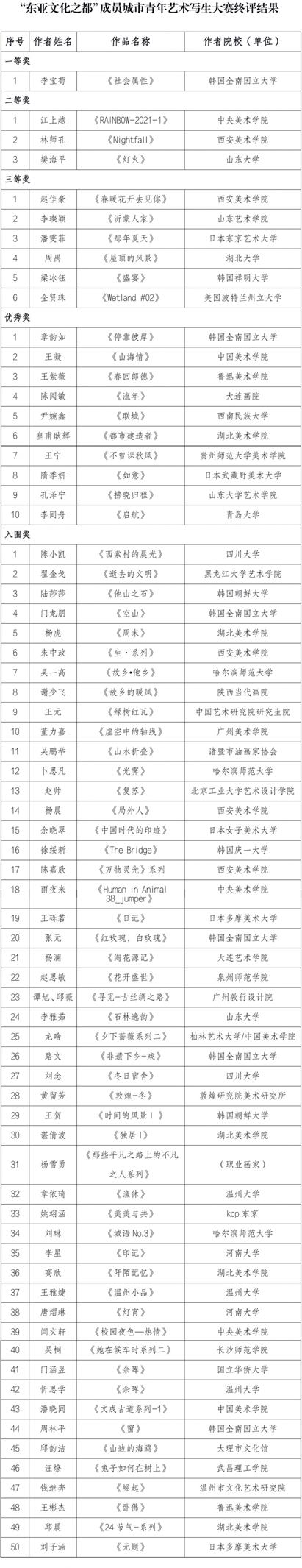 This activity was jointly hosted by Wenzhou Municipal Bureau of Culture, Radio, TV and Tourism, Tokyo China Cultural Center and Seoul China Cultural Center. Since its launch, it has received extensive attention and support from youth artists in China, Japan and South Korea. As of October 31, the organizing committee has received a total of 527 works from various art colleges and institutions in China, Japan and South Korea. The final selected 70 award-winning works are hereby announced as follows.