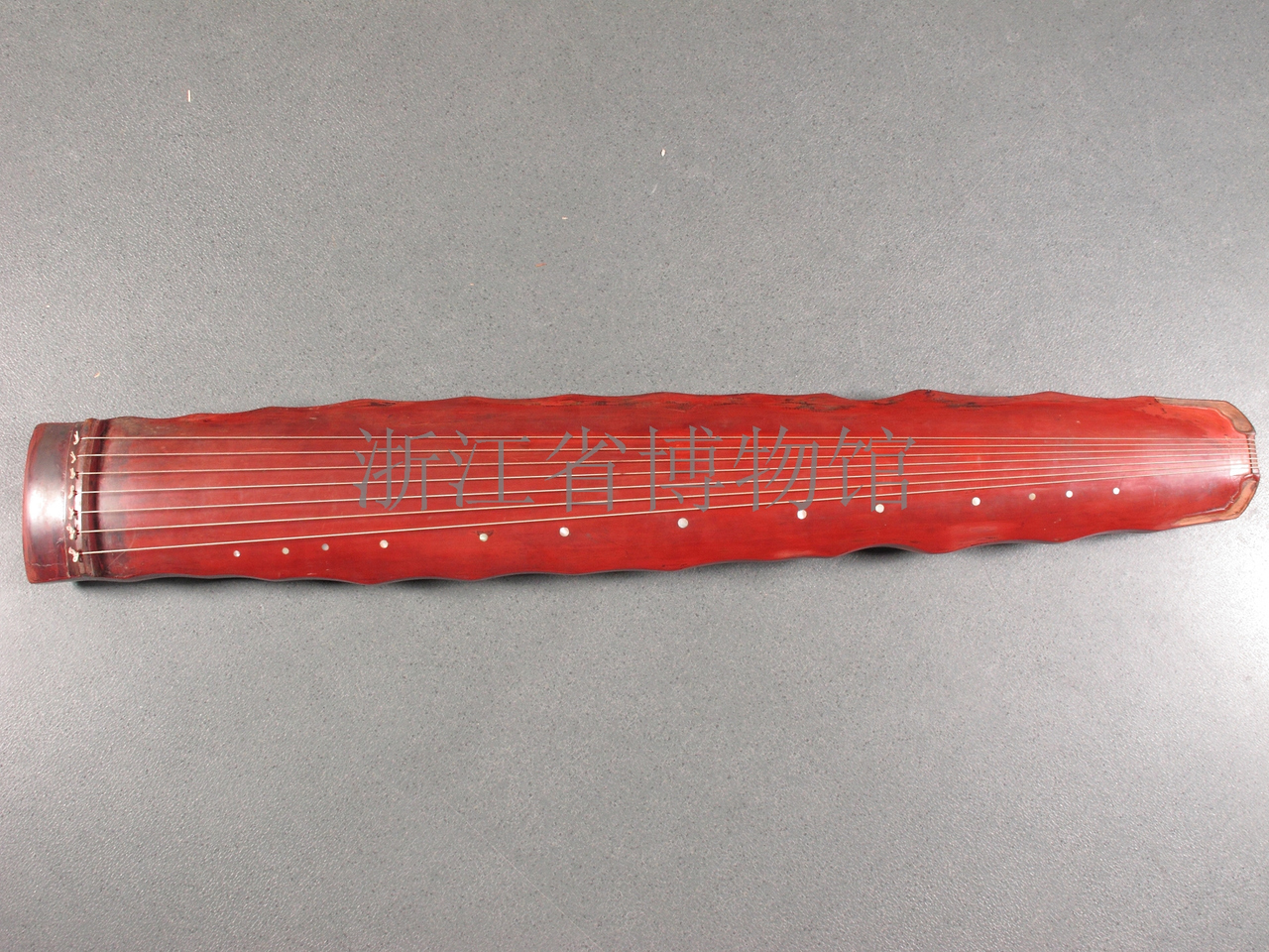 Description: The guqin has a thick body and a slightly convex back. Beneath the lacquer is a layer of ‘deer antler putty’, which is rather thick as revealed at the places where it has peeled off. The back is covered mainly with the original chestnut-coloured lacquer, which is interspersed with red lacquer. The top and sides of the instrument have a coating of red lacquer over the original lacquer. The back bears 'ice cracks' and 'bridge-over-stream cracks'. The top bears an indistinct crack pattern, with small circles resembling 'plum blossom cracks' near the third, fourth and fifth hui (dots indicating the positions for producing harmonics). The instrument has a 'dragon pool' and a 'phoenix pond', both oblong, but no zhenchi ('tuning pegs pool'). The name of the guqin, 'Caifeng Mingqi' (colourful phoenix crying on Mount Qi), appears above the 'dragon pool', which is surrounded by three eulogizing inscriptions by Yang Zongji. Engraved within the 'dragon pool' are the words 'made by Lei Wei in the 2nd year of Kaiyuan of Great Tang' (ad 714). This instrument has a classical and dignified appearance and makes a sound suggestive of that of bronze bells or chime stones. A description of it can be found in Qin Xue Cong Shu (A Series of Books on Guqin Studies). As one of the three guqin most treasured by Yang Zongji, it was praised by the master for the exceptional quality of its sound.