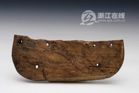 History: Dish-shaped objects like this can be made of ivory, wood or stone. The front is flat and partly adorned with an incised design, while the back is rather crudely processed. Each object has crosswise grooves in the middle and a varying number of small holes for fastening it to a handle. Made of ivory, this object has been broken and has six small holes drilled through it. Incised at the center of the front side is a common design of circles with a flame-like edge. On both sides of and connected to the circles are two symmetrical birds raising their heads to look at each other, with a slight difference in the amount of detail. The image has been interpreted to represent two birds worshipping or carrying the sun. Around the birds are curves and dotted lines linking the holes.