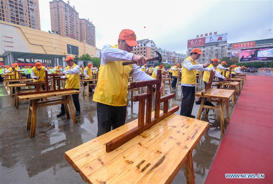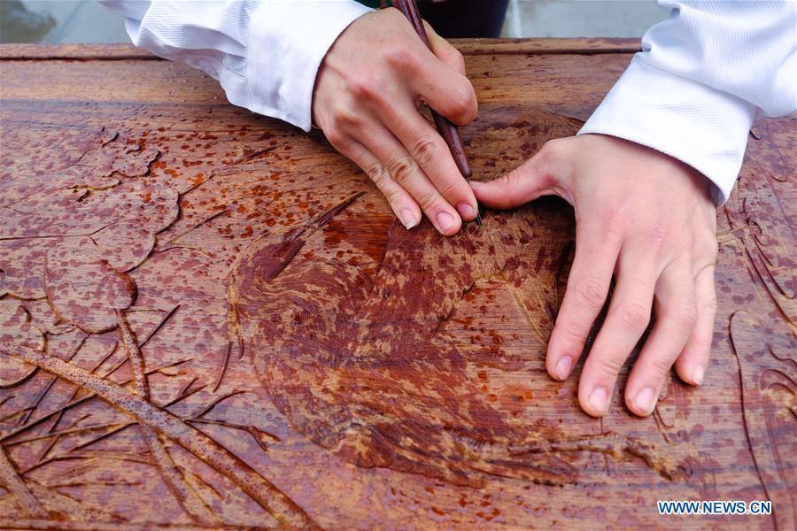 Aerial photo taken on April 11, 2019 shows craftsmen demonstrating skills of making wooden crafts at Huayuan Village of Nanma Town in Dongyang, east China's Zhejiang Province. Huayuan is a renowned wooden crafts and mahogany furniture wholesale market in China, as well as a scenic area in the region. (Xinhua/Xu Yu)