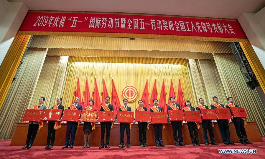(Representatives pose for a group photo at a conference held to highlight the contribution of "model workers" and groups in Beijing, capital of China, April 23, 2019.)