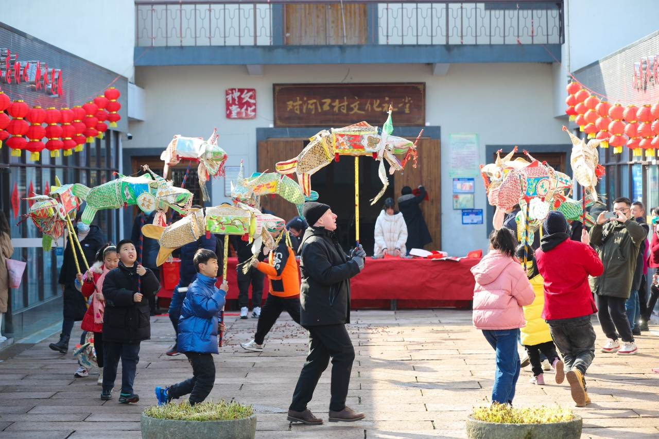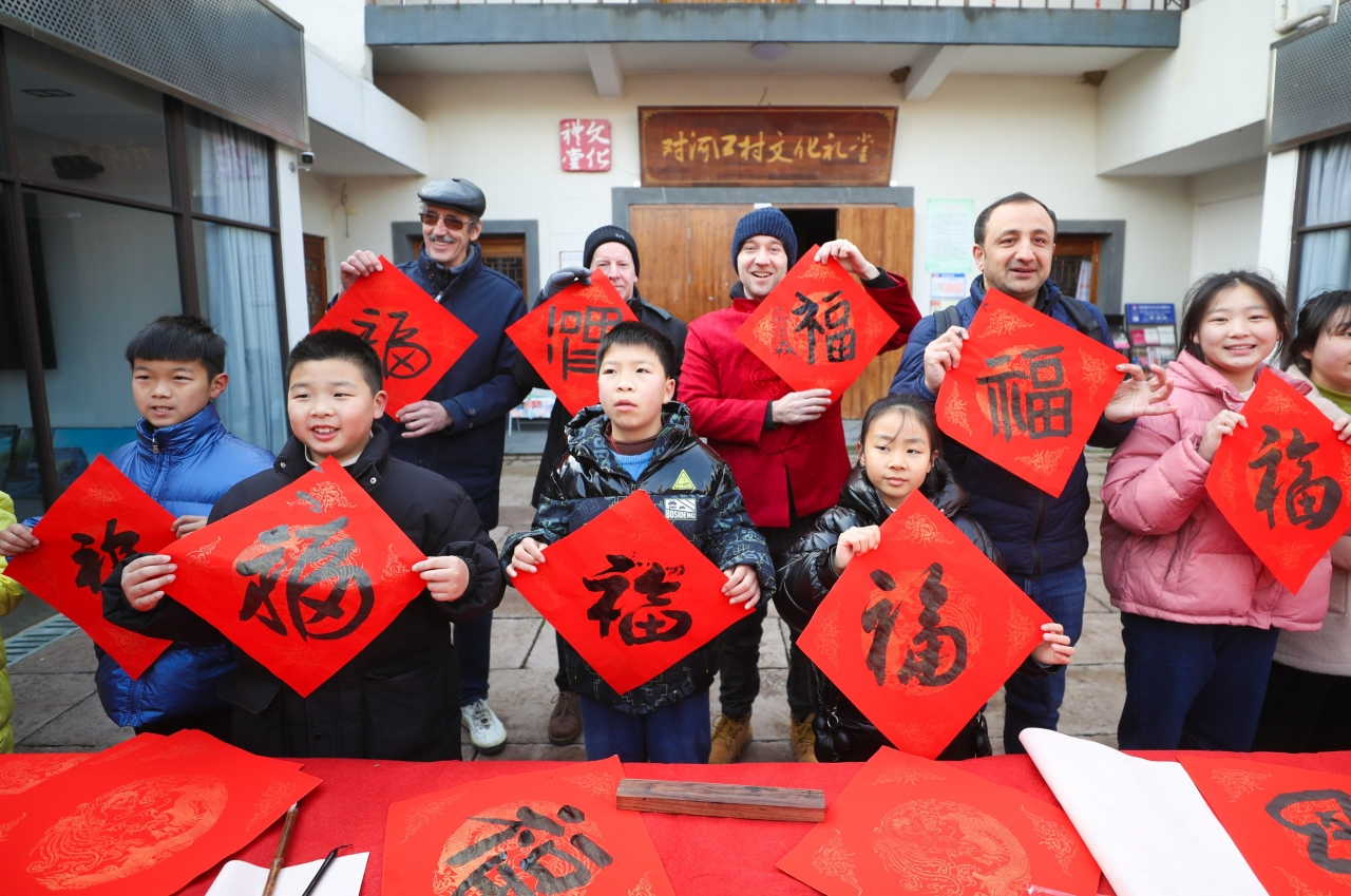 On Jan 16, the "Welcome the Chinese New Year" activity was held at Wukang Street in Deqing County. Foreign friends from Russia, Australia and New Zealand, under the guidance of local villagers, experienced writing Fu characters, dancing turtle lanterns, cutting paper-cuts for window decoration and other traditional Chinese folk customs to welcome the Spring Festival.