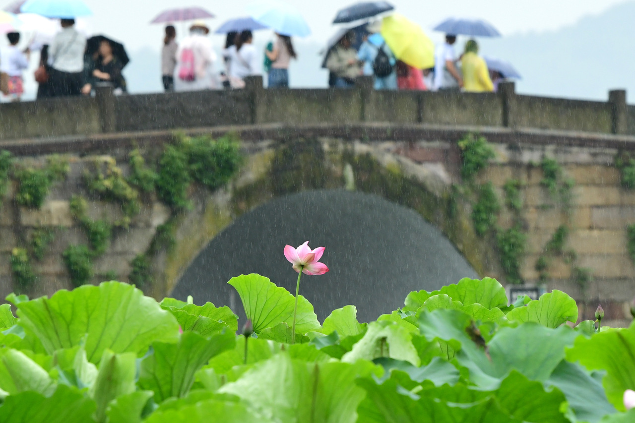 On June 13, 2019, the rain added to the unique charm of lotus flowers in West Lake of Hangzhou, attracting many tourists.