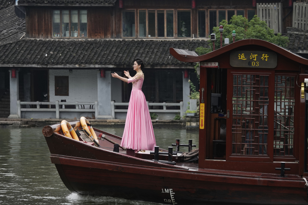In celebration of the fifth anniversary of the designation of the Grand Canal as a UNESCO World Heritage Site, a grand ceremony was held in Hangzhou, Zhejiang Province on June 22, 2019. The photo shows a singer performing on a boat on the Grand Canal.