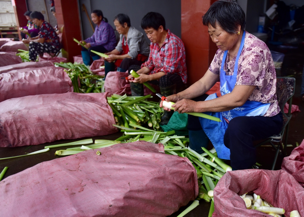 Photo show farmers processing and packaging wild rice shoots just harvested from the fields in Wuyi County, Jinhua City, Zhejiang Province, June 20, 2019. The harvests will be delivered to Hangzhou, Quzhou, Wenzhou, etc.