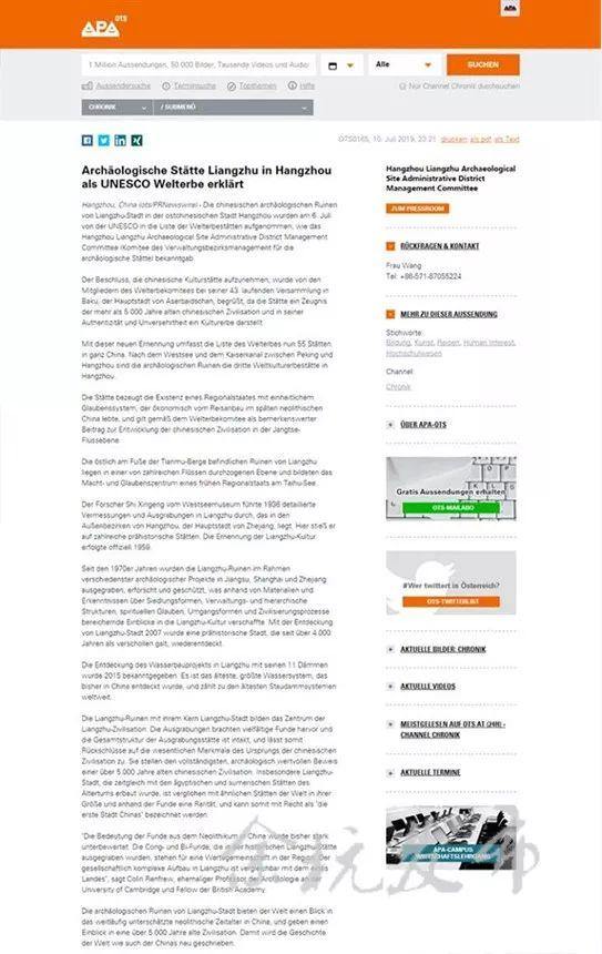Official websites of ABC, Austria Presse Agentur and Yonhap News Agency: The Archaeological Ruins of Liangzhu City that centered on Liangzhu Ancient City is the core of Liangzhu civilization, which reveals the basic characteristics of the origin of Chinese civilization and provides the most complete and important archaeological material evidence for the more-than-five-thousand-year history of Chinese civilization. Liangzhu Ancient City, completed in the same period as the ancient Egyptian and Sumerian civilizations, be it in scale or significance, is rarely seen among similar historical sites in the world and can be considered as the “No. 1 City of China”.