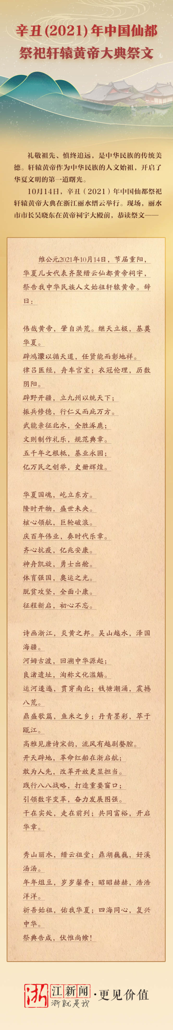 Editor's Note: The grand ceremony paying homage to Xuanyuan Huangdi, the legendary ancestor of the Chinese nation, is held on Oct 14 at the Xiandu Scenic Spot in Jinyun County, Lishui city, East China's Zhejiang province. Let's have a look at today's "Zhejiang Highlights".
