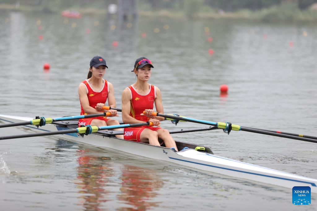 Zou Jiaqi (L) and Qiu Xiuping of China compete during the Women's Lightweight Double Sculls final of rowing at the 19th Asian Games in Hangzhou, east China's Zhejiang Province, Sept. 24, 2023. (Xinhua/Jia Haocheng)