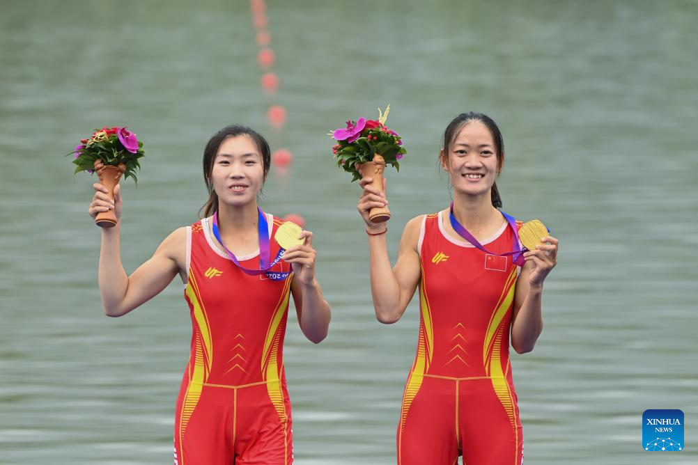 Zou Jiaqi (L) and Qiu Xiuping of China pose during the awarding ceremony for the Women's Lightweight Double Sculls of rowing at the 19th Asian Games in Hangzhou, east China's Zhejiang Province, Sept. 24, 2023. Zou Jiaqi and Qiu Xiuping claimed the first gold medal of the 19th Asian Games. (Xinhua/Du Xiaoyi)
