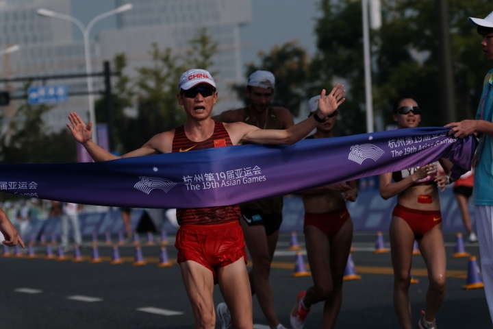 On September 29, the first day of the track and field competition of the 19th Asian Games in Hangzhou, the men's and women's 20-kilometer race walking finals were held on the bank of the Qiantang River.