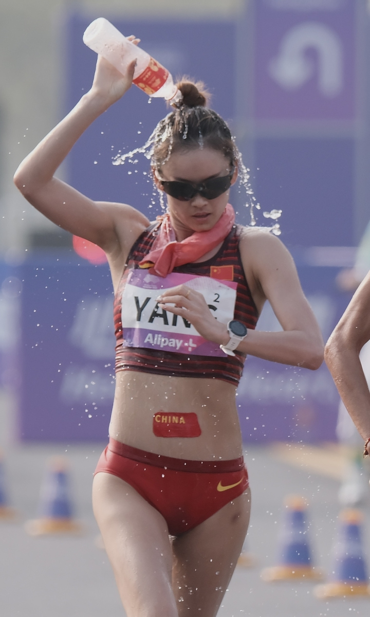 Chinese athlete Yang Jiayu won the Asian Games women's 20-kilometer race walking gold medal. (Photo by Tide News reporter Wu Huang)