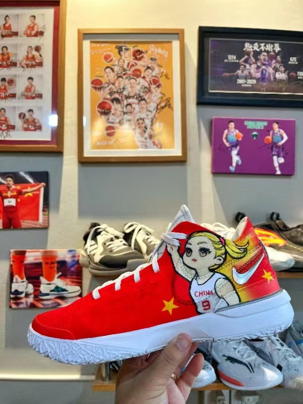 Wang Haibo had received an order from Li Meng before and drew a pair of sneakers for Li Meng that she wore when she played with the WNBA." Obviously Li Meng was very satisfied with this pair of shoes. Not only did she wear them in WNBA games, but she also sent two pairs of shoes before the Asian Games for Wang Haibo to continue to help her draw customized patterns.