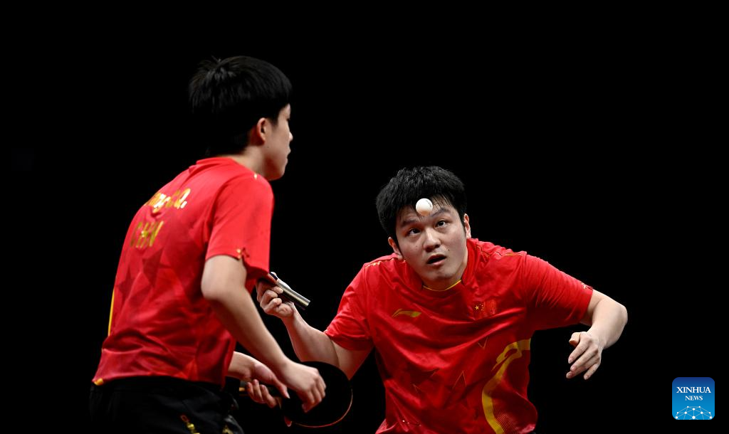 Fan Zhendong (R)/Wang Chuqin of China compete during the Men's Doubles Semifinal of Table Tennis between Fan Zhendong/Wang Chuqin of China and Nima Alamian Darounkolaei/Noshad Alamiyan Daronkolaei of Iran at the 19th Asian Games in Hangzhou, east China's Zhejiang Province, Oct. 1, 2023. (Xinhua/Liu Xu)