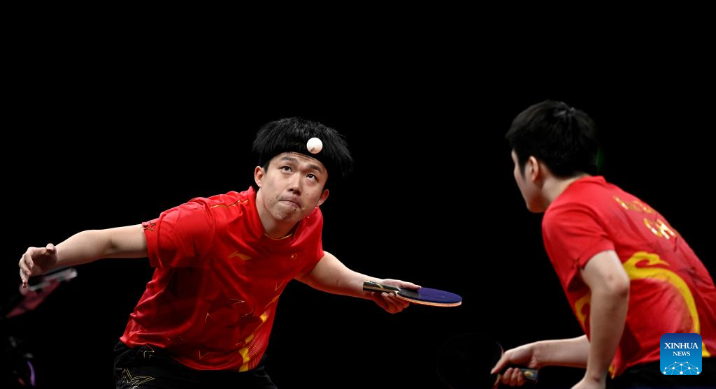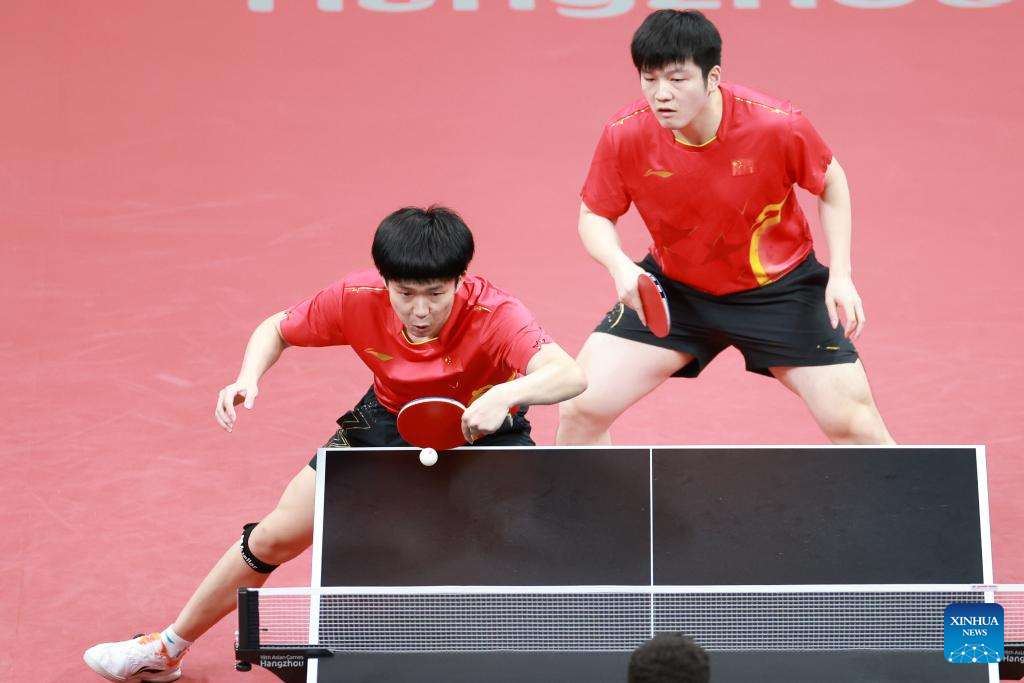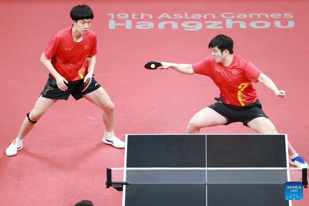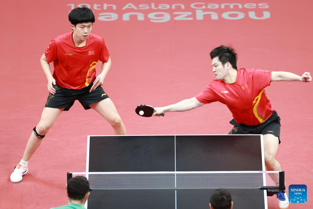 Fan Zhendong (R)/Wang Chuqin of China compete during the Men's Doubles Semifinal of Table Tennis between Fan Zhendong/Wang Chuqin of China and Nima Alamian Darounkolaei/Noshad Alamiyan Daronkolaei of Iran at the 19th Asian Games in Hangzhou, east China's Zhejiang Province, Oct. 1, 2023. (Xinhua/Wang Peng)