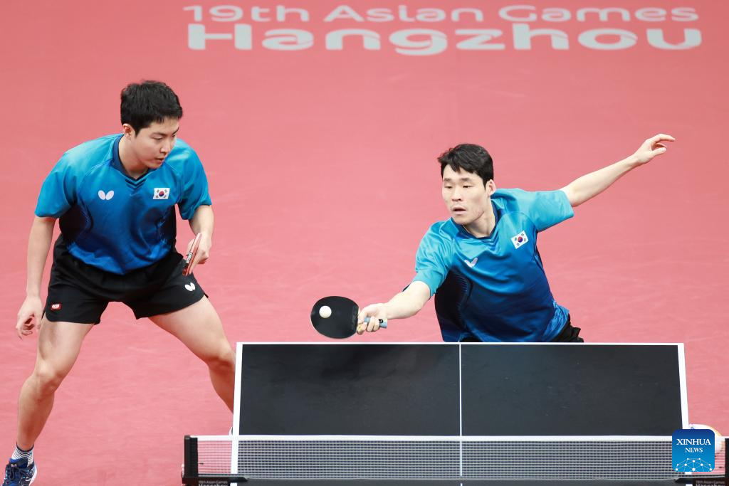 Jang Woojin/Lim Jonghoon (L) of South Korea compete during the Men's Doubles Semifinal of Table Tennis between Jang Woojin/Lim Jonghoon of South Korea and Chuang Chih-Yuan/Lin Yun-Ju of Chinese Taipei at the 19th Asian Games in Hangzhou, east China's Zhejiang Province, Oct. 1, 2023. (Xinhua/Liu Xu)