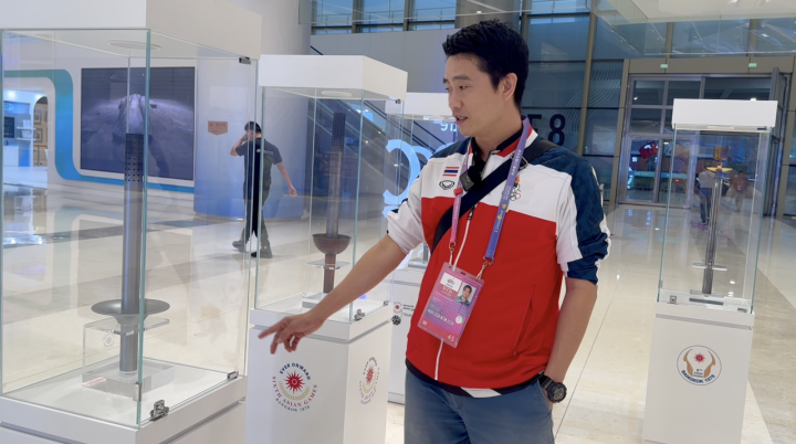 On September 30, the main media center of the Asian Games in Hangzhou displayed torches from previous Asian Games. Thai journalist Rativiriyapong found the torch that was used when Thailand hosted the Asian Games four times. This is his first time to participate in the Asian Games, he said, his job in Hangzhou is very comfortable and he prepared the Asian Games Mascots as a surprise for his daughter.