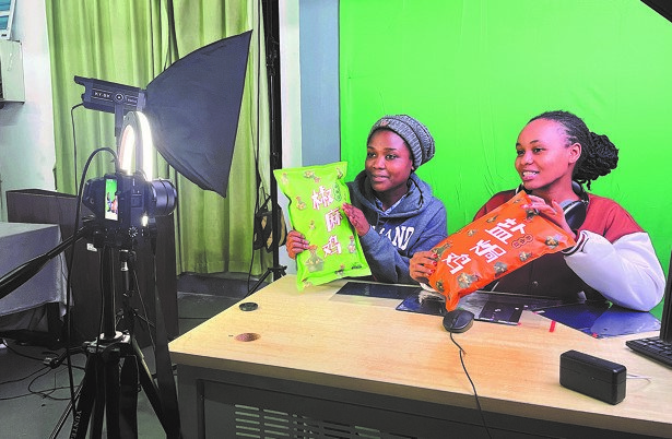Rwandan students from Jinhua University of Vocational Technology conduct a livestreaming sales session in Jinhua, Zhejiang province, on Oct 7, 2024. [Photo provided to China Daily]