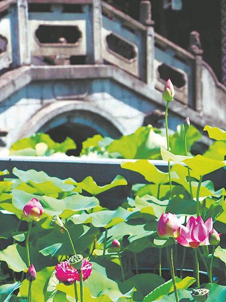 Picturesque scene of lotus flowers beside a bridge in Zhejiang province.CHINA DAILY