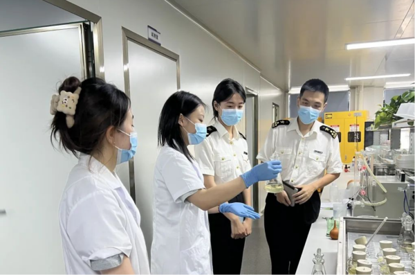 Two R&D staff members demonstrate the production process to customs officers. [Photo/Tide News]