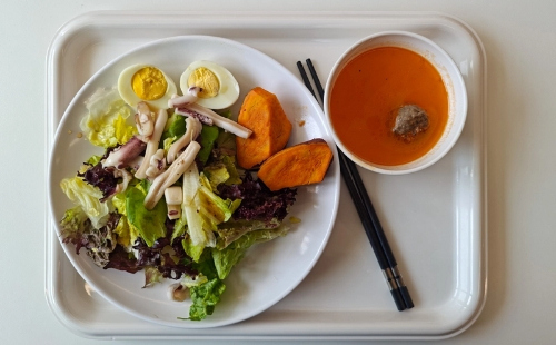 A meal tray with salad, boiled eggs, roasted sweet potatoes, and tomato soup with a meatball is served at a cafeteria in Shaoxing. [Photo/IC]