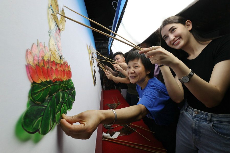 An overseas student at the Zhejiang University of Technology experiences shadow play at Xinshi ancient town of Deqing county, East China's Zhejiang province, on July 24, 2022. (Photo/ Xinhua)
