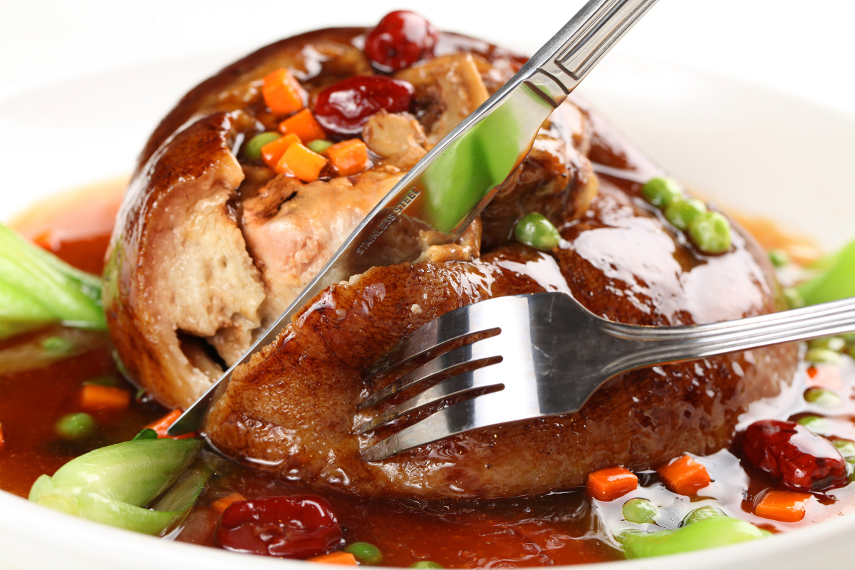 The pork is stewed along with vinegar, scallion, ginger, and sugar, in a sealed casserole pot over a low heat. It's as soft as tofu but not fragile, glutinous but not greasy. This famous dish is named after Su Dongpo, a governor of ancient Hangzhou and a great poet, prose writer and calligrapher too. During his term, as governor, he started the thorough dredging of the West Lake, a project involving thousands of workers and which benefited the local people immensely. It is no secret that Su Dongpo liked eating pork so, in order to express their gratitude, the local people, during Chinese New Year, presented Su Dongpo with a lot of pork and Shaoxing Wine (a type of cooking wine in Chinese cuisine). Su Donpo knew all too well that it was the workers who truly deserved the gift, so he told his family to stew together the pork and Shaoxing Wine and distribute the resulting dish to the workers. It turned out that the pork was extremely tasty and because of Su Donpo’s kindness Dongpo Pork became widely favored by all. The pork used for this dish needs to be half fat and half lean and is usually cut up into cubes. Then the pork, along with vinegar, scallion, ginger, and sugar, is left to stew in a sealed casserole dish over a low heat for about one hour. The pork cooked in this way glows red and is as soft as tofu and while it may be glutinous it is nowhere near greasy.