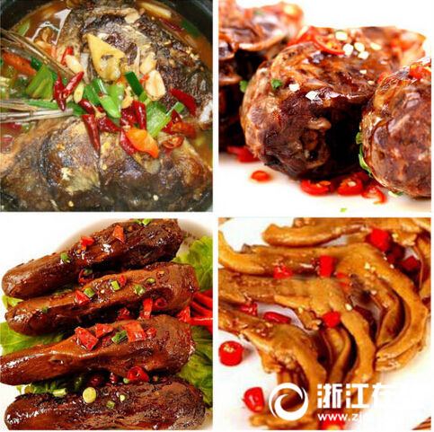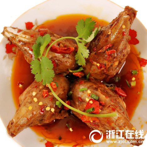 The signature snack in Quzhou, a city in western Zhejiang Province, is a dish called “three heads, one foot”, or a rabbit head, a duck head, a fish head and duck flippers. The dish is heavily spicy that it may make your lips and tongue sting. It takes courage to try it, but a minute to fall in love with its taste.