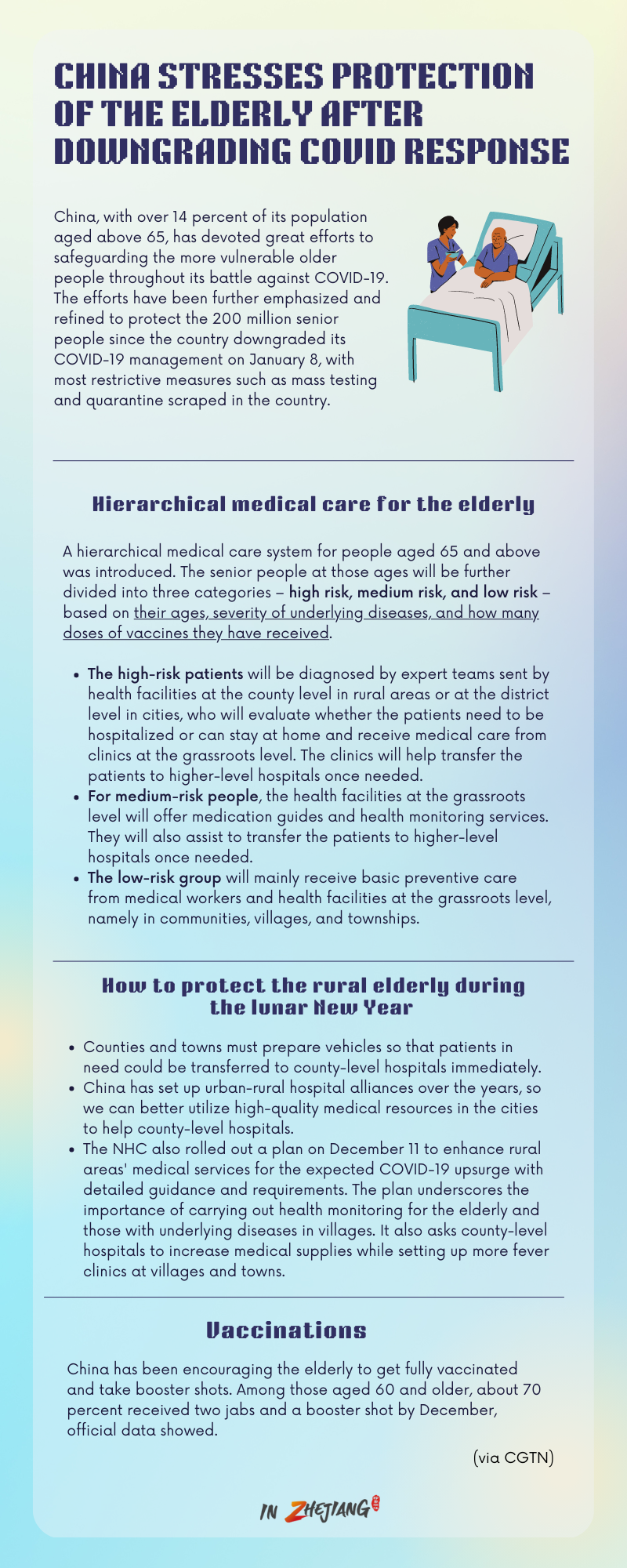China has devoted great efforts to safeguarding the more vulnerable older people throughout its battle against COVID-19. The efforts have been further emphasized and refined to protect the senior people since the country downgraded its COVID-19 management on January 8.