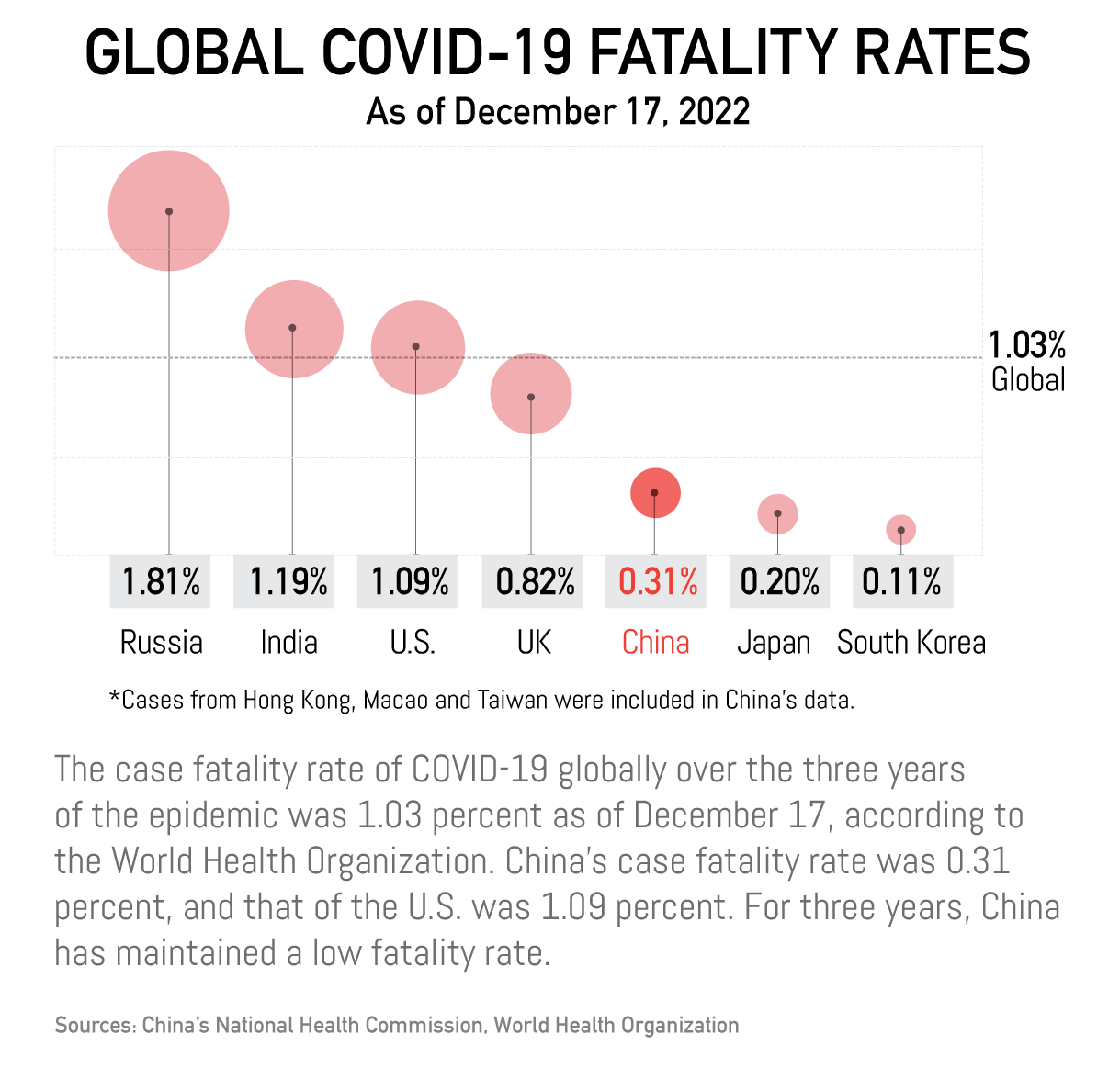 Though China accounts for 18.32 percent of the world's population, the country's COVID-19 death toll remains far below the global average.