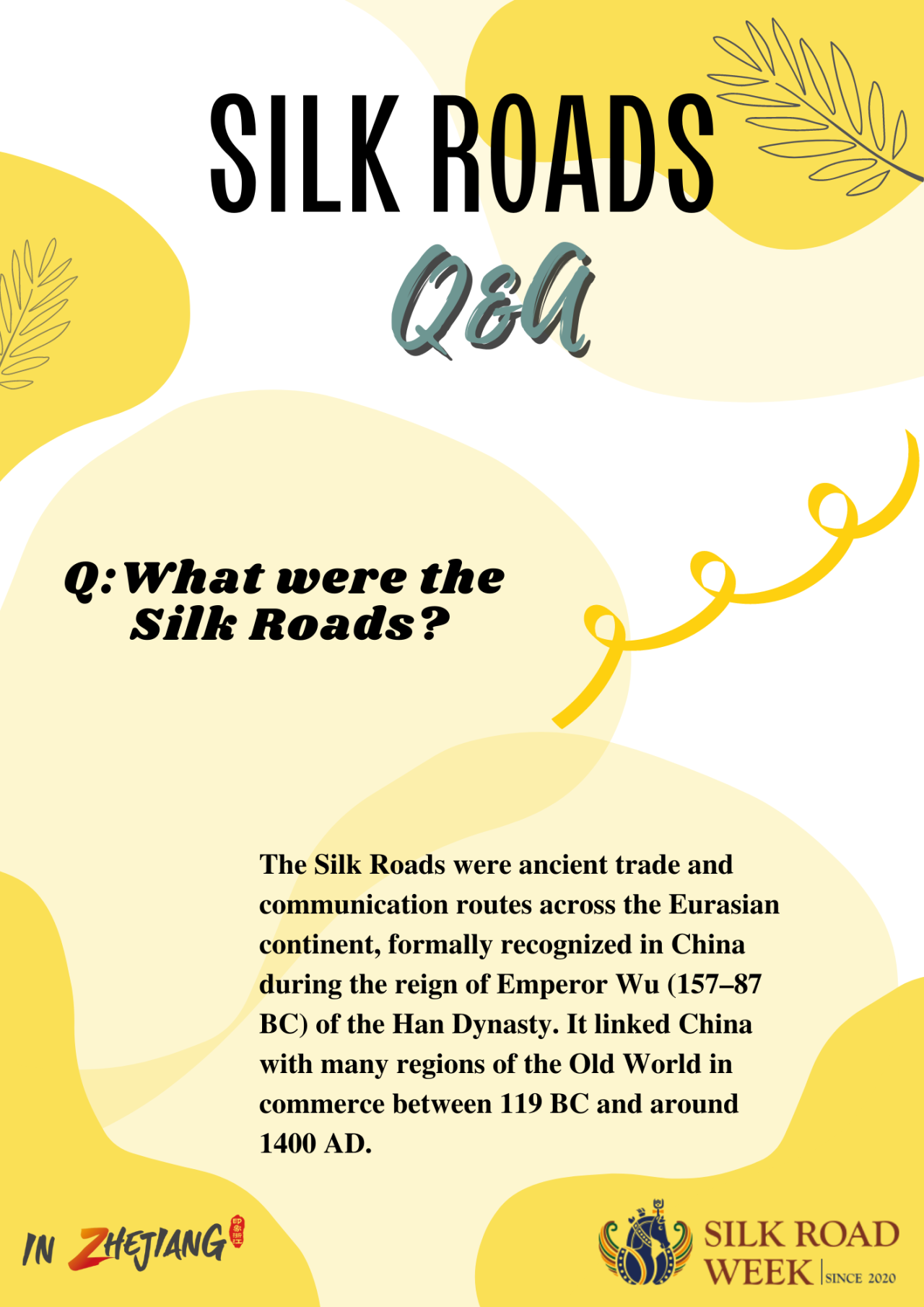 A: The Silk Roads were ancient trade and communication routes across the Eurasian continent, formally recognized in China during the reign of Emperor Wu (157–87 BC) of the Han Dynasty. It linked China with many regions of the Old World in commerce between 119 BC and around 1400 AD.