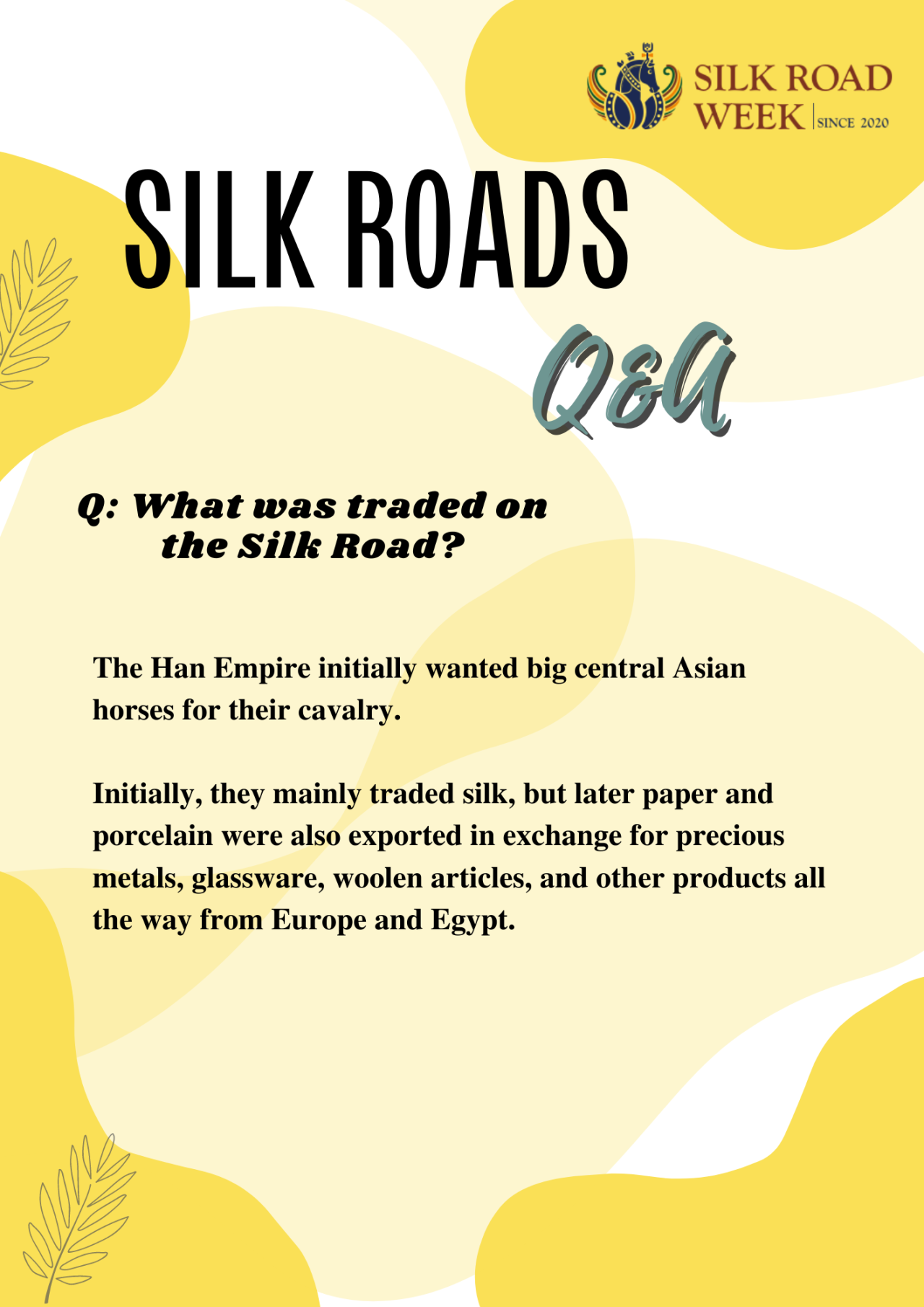 A: The Han Empire initially wanted big central Asian horses for their cavalry. Initially, they mainly traded silk, but later paper and porcelain were also exported in exchange for precious metals, glassware, woolen articles, and other products all the way from Europe and Egypt.