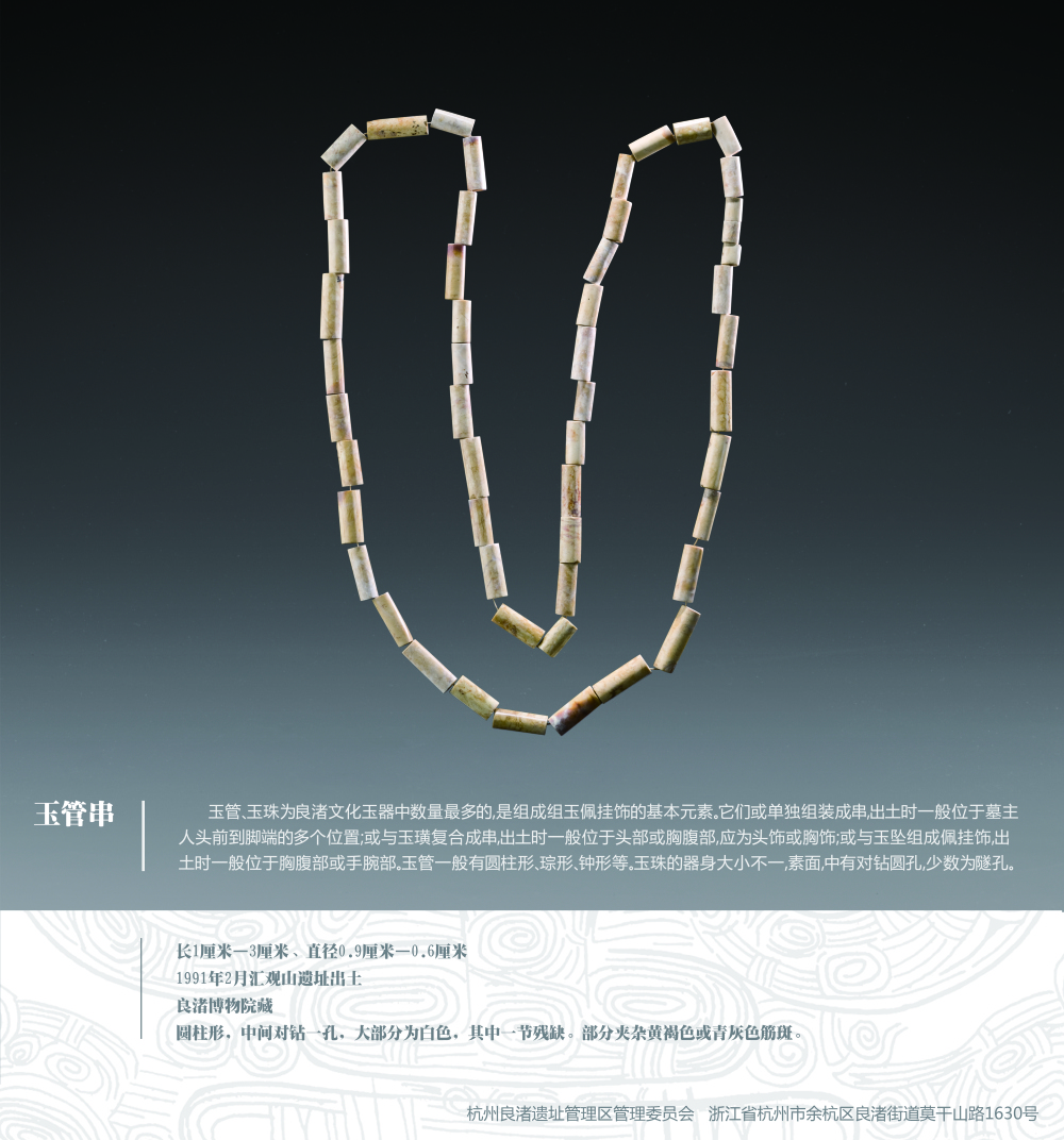 The cylindrical jade beads and circular jade beads are the most commonly seen jade artifacts of Liangzhu culture. They were strung into adornments to be worn on the head, chest and wrist.