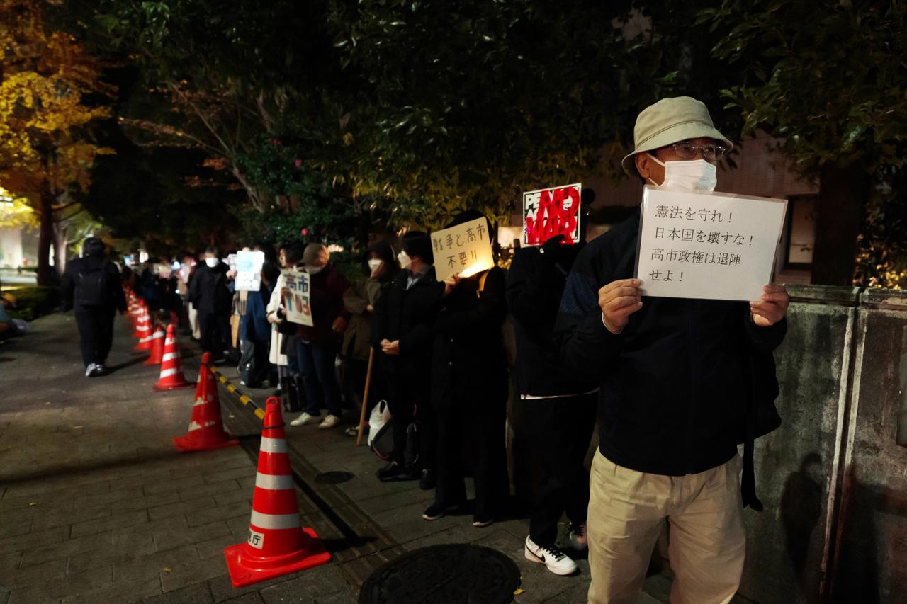 这是继21日和25日的抗议活动后,在首相官邸前举行的又一次大规模抗议集会,有数百人参加。抗议者手持写有“高市辞职”“不能忘记历史,不能重蹈覆辙”等字样的牌子,要求高市撤回涉台错误言论。