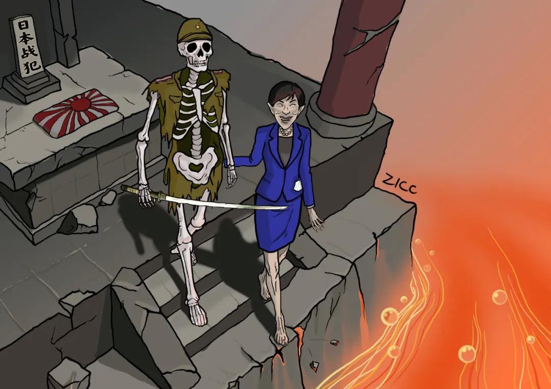 在现场,日本民众手持漫画中还有一幅为浙江省国际传播中心(简称“ZICC”)的原创作品。画面中,高市为日本战犯招魂,把日本带往万劫不复的战争歧途。这幅漫画名为《玩火自焚(She who plays with fire will get burned)》,11月24日发布在印象浙江英文网及ZICC海外社交平台,发布首日浏览量即突破200万次,引起国际上爱好和平人士特别是日本民众的共鸣,怒斥高市的错误行径。