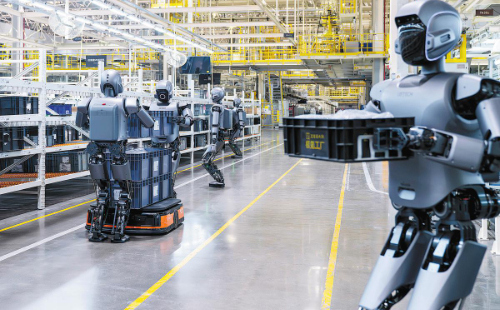 Humanoid robots work at a smart factory of electric car manufacturer Zeekr in Ningbo, Zhejiang province, on March 1. [Photo/Yu Changsheng for China Daily]