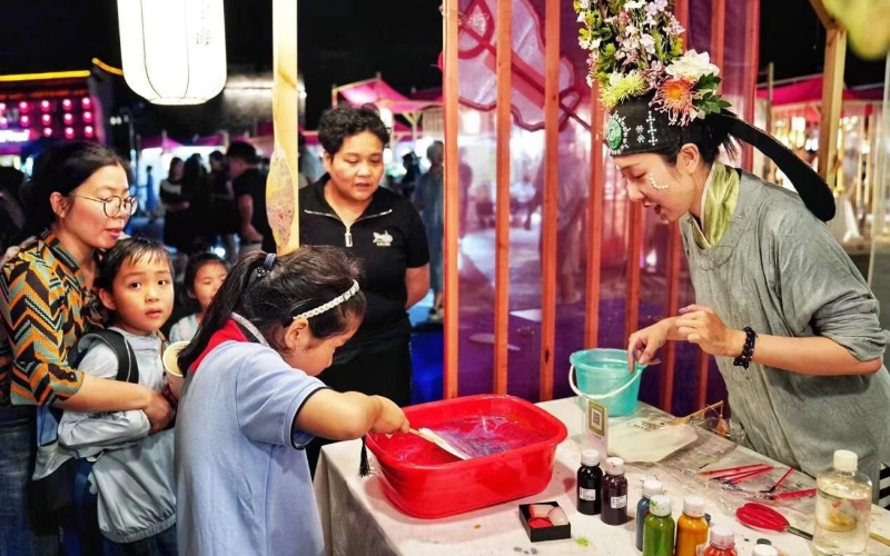 A child experiences cultural heritage at a night market in Ninghai county. [Photo provided to chinadaily.com.cn]
