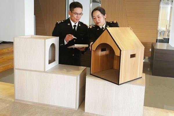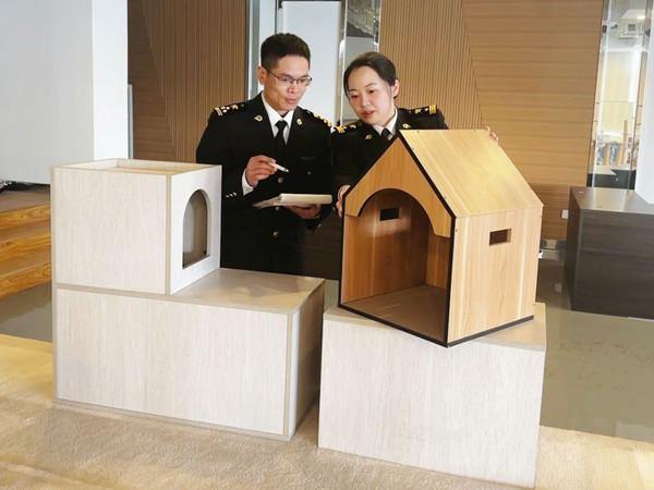 Huzhou Customs officials inspect wooden pet houses set for export. [Photo/Tide News]