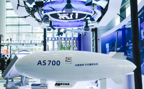A model of China's AS700D electric manned airship is displayed at a sideline exhibition of the 2025 Shaoxing Development Conference. [Photo provided to ezhejiang.gov.cn]
