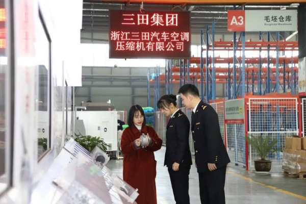 Two Lishui Customs officers inspect products from Zhejiang Santian A/C Compressor in Lishui, Zhejiang province. [Photo provided by Lishui Customs]
