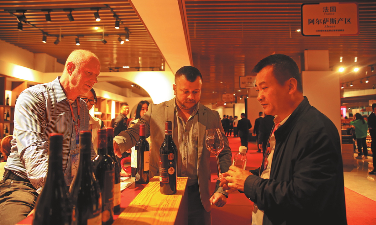 French exhibitors introduce their wines to a visitor during the Qingtian Imported Wine Fair in Zhejiang province on Nov 12, 2023. FU FEIYANG/CHINA NEWS SERVICE