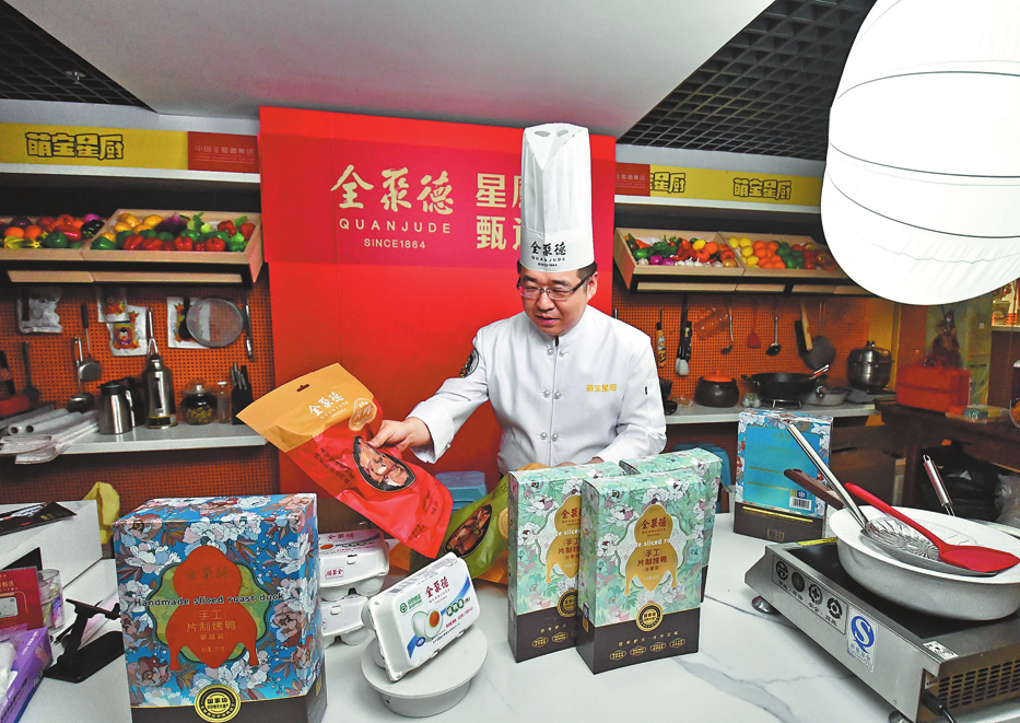 A chef of Quanjude Group prepares for a livestreaming sales session in Beijing on March 13. LI XIN/XINHUA