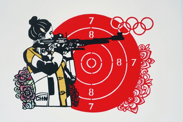 Another notable piece is Shen Yang's Olympic Shooting Champion Huang Yuting, which shows Huang Yuting, an athlete from Huangyan district, as she prepares to open fire at the Paris Olympics.