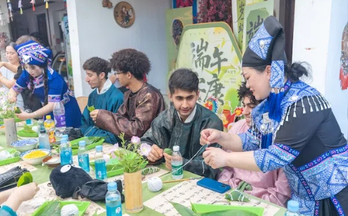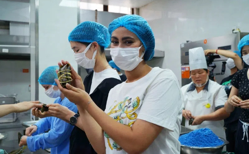 Locals teach international students how to make zongzi in Ningbo. [Photo provided to chinadaily.com.cn]