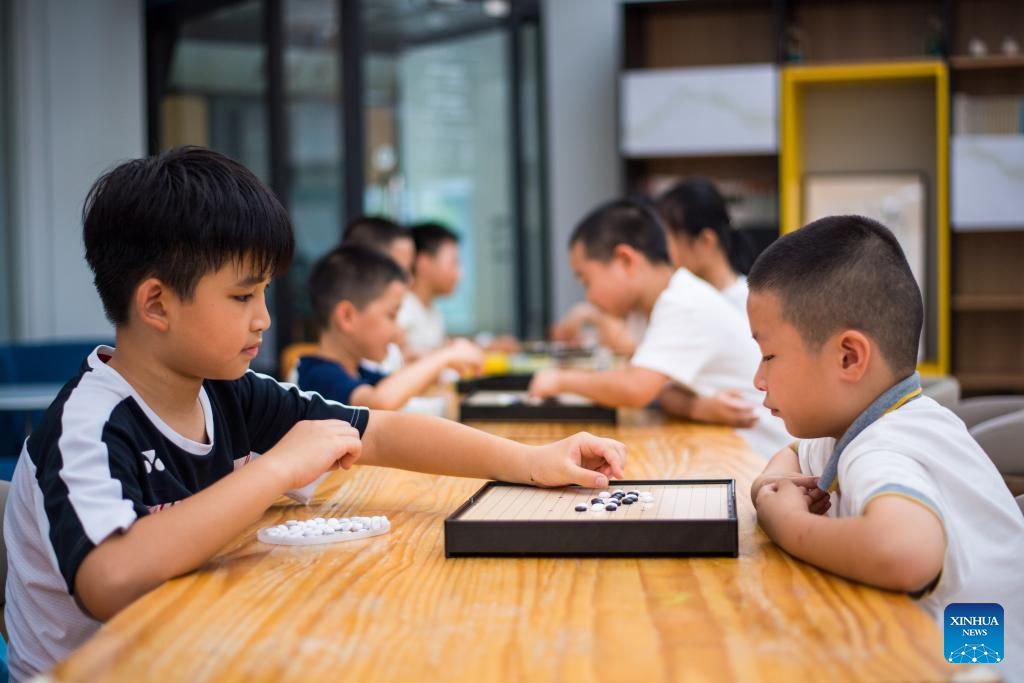 Children play board games at a community service center in Shangcheng District of Hangzhou City, east China's Zhejiang Province, July 21, 2025. Community service centers in Hangzhou provide childcare assistance and various activities to enrich children's summer vacation. (Xinhua/Jiang Han)