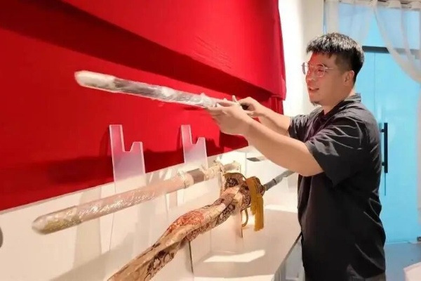 Jin Jing shows the swords he crafted in Longquan, a county-level city of Lishui, Zhejiang province. [Photo/Tide News]