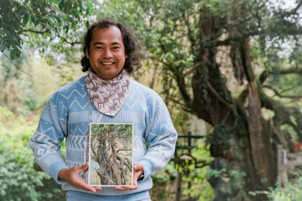 A Bangladeshi doctoral student expressed his fascination with a 1,500-year-old ancient camphor tree, saying that the beautiful scenery and fresh air made painting here a happy and comfortable experience.